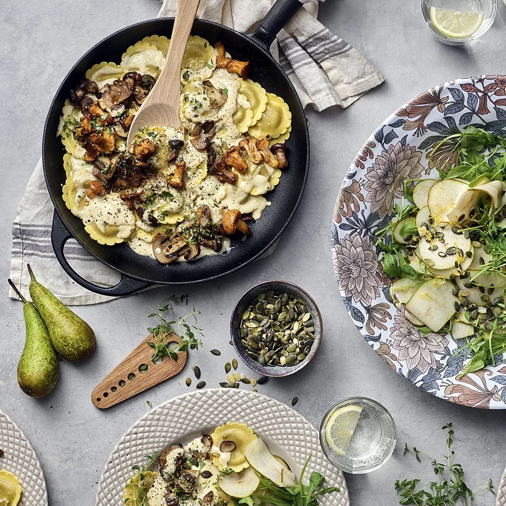 Pumpagnocchi med svampsås och bakade körsbärstomater