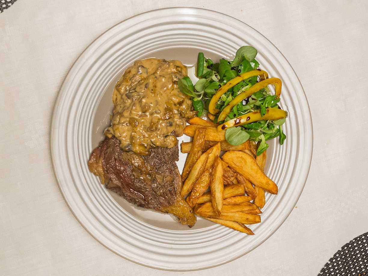 Grytstek med crashed potatoes, svampsås, pressgurka och rårörda lingon