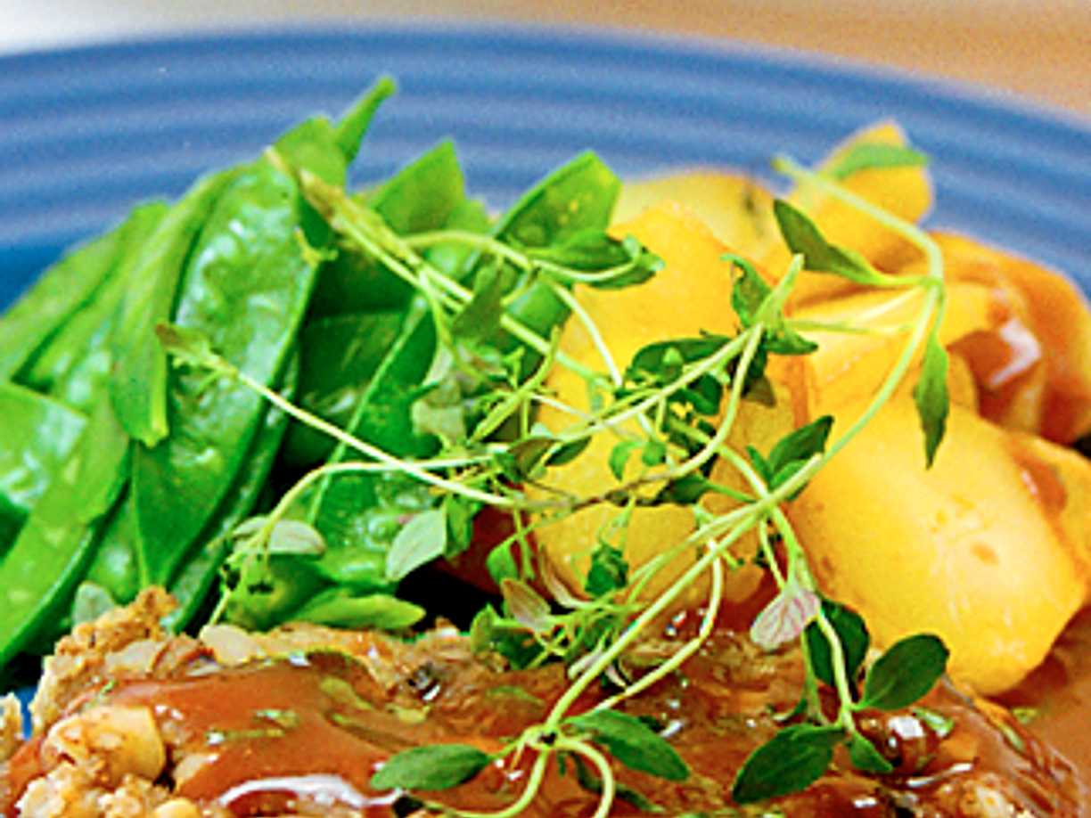 Timjanstekt fläskkotlett med rostad potatis och gräddig svampsås