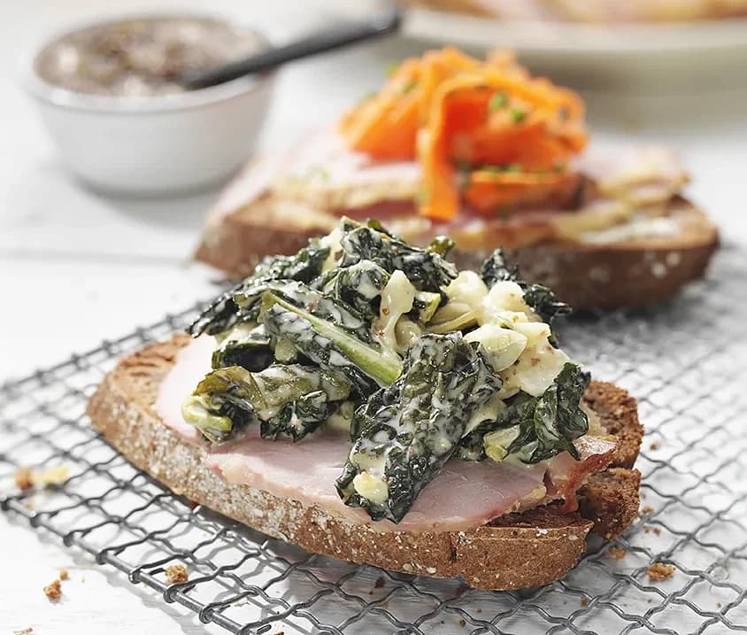 Skinkmacka med gräddstuvad svartkål och syrad ingefärsmorot
