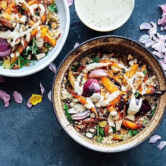 Harissamorötter med couscous och tahini