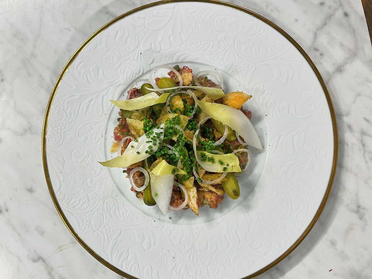 Tartar på oxfilé med misomajaonnäs och lotusrotchips