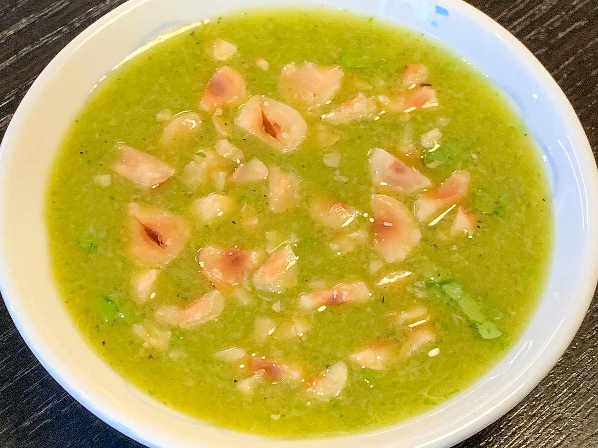 Morotskräm med frästa gröna bönor och örtigt pistagekross