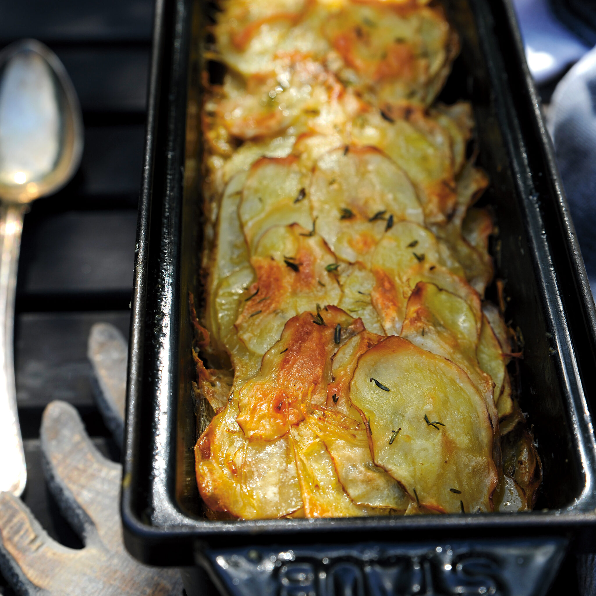 Sommarmjuk potatislåda med smak av parmesan och timjan