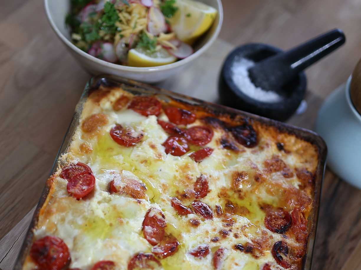 Stekt kyckling på pestogratinerade tomater och mozzarella
