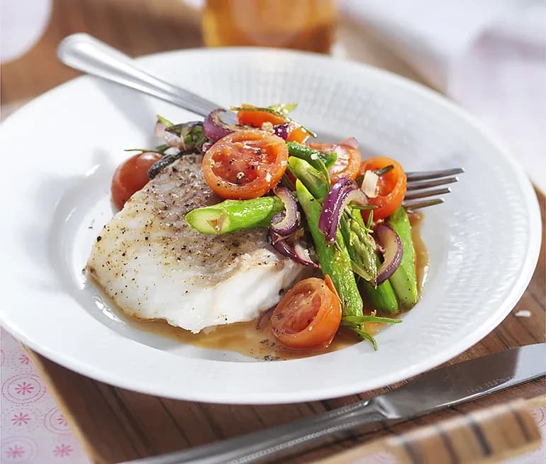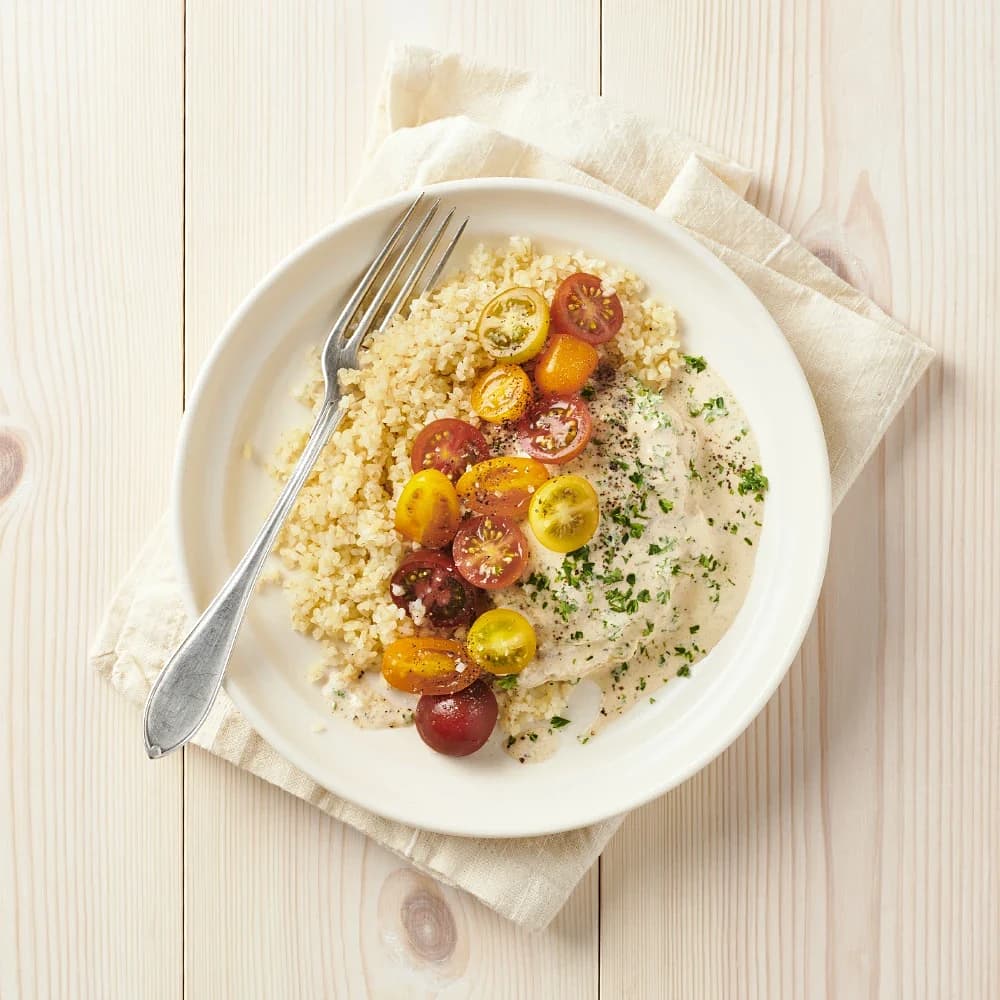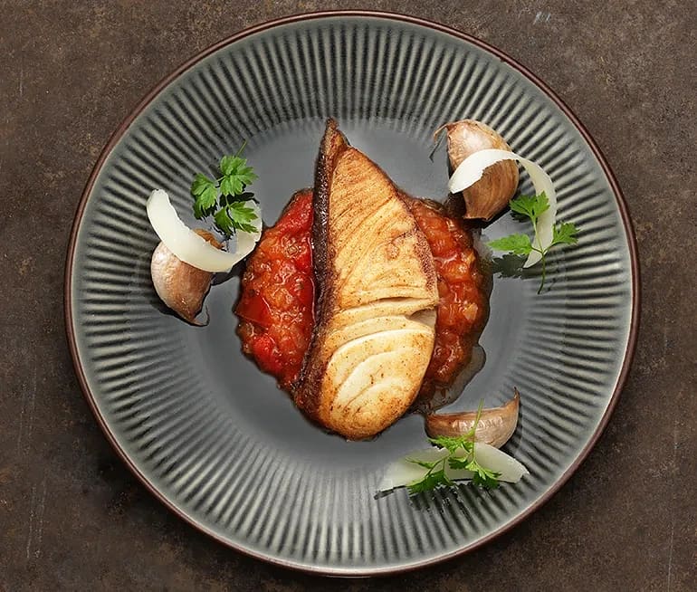 Stilla havshälleflundra med tomat, kronärtskocka och confiterad vitlök