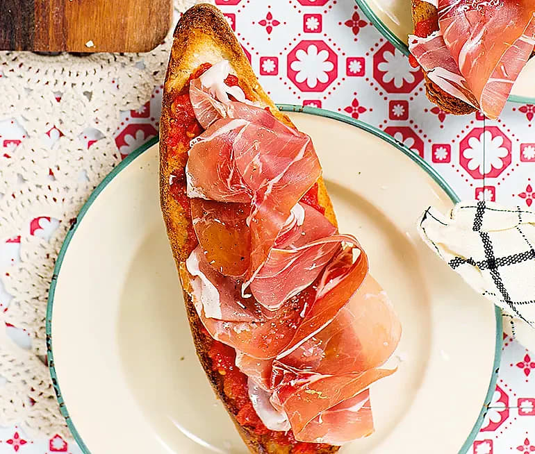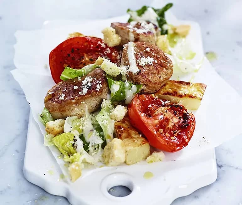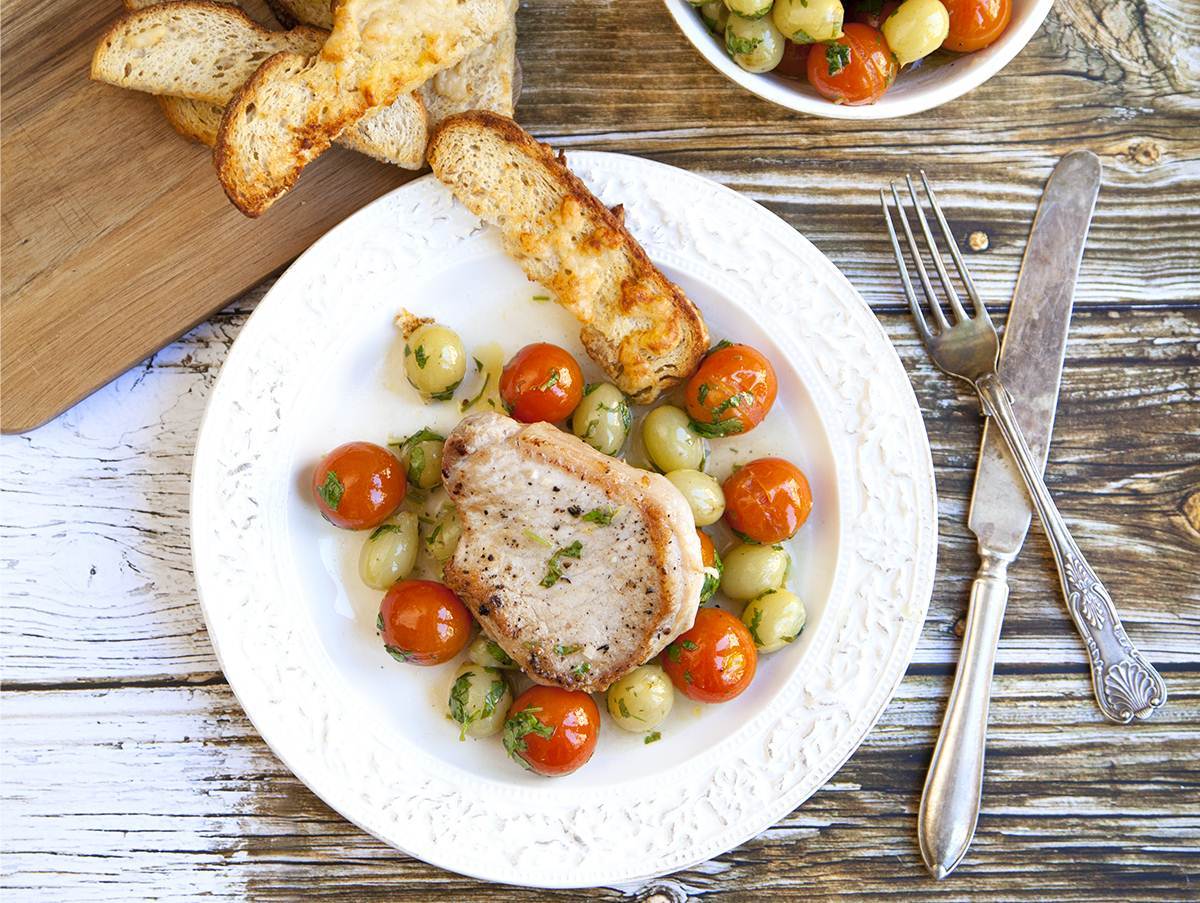 Tinas fläskkotletter med varma tomater, druvor och parmesanbröd