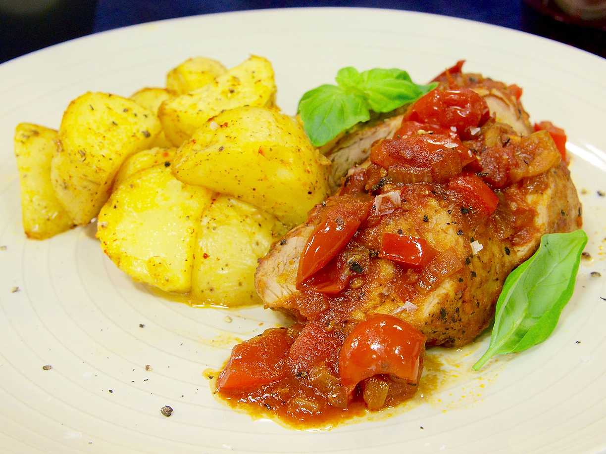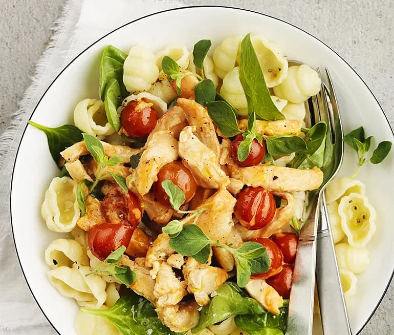 Kyckling med basilika- och citronolja samt mozzarellagratinerad broccoli och tomat