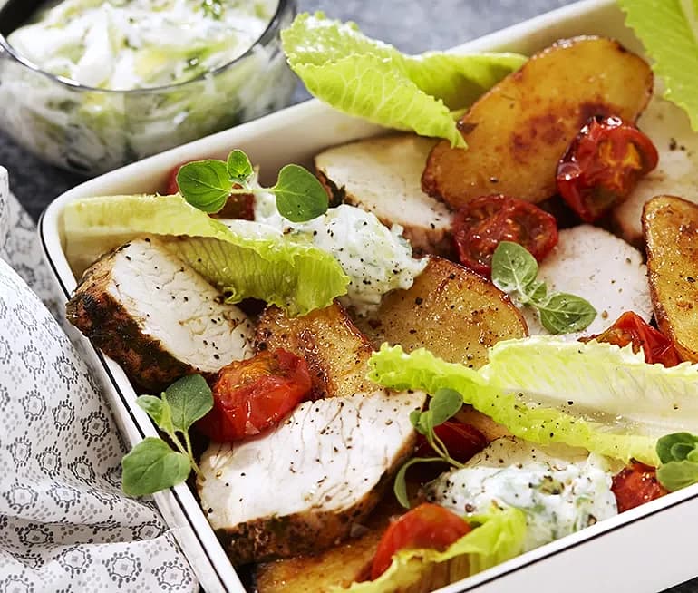 Oreganostekt kalkon med tzatziki och bakad tomat