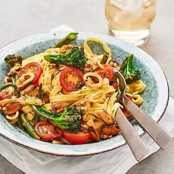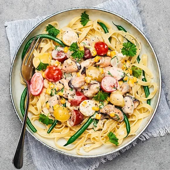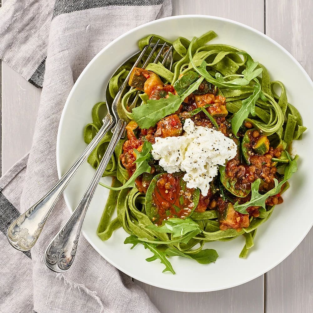 Ostfylld tortellini med zucchini, tomat och champinjon