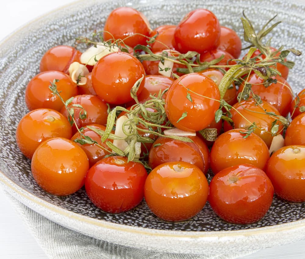 Hagelsta Källa blå under bruléetak med honungskanderade tomater