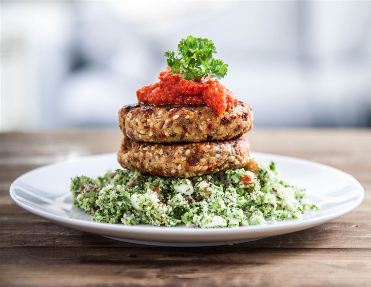 Veggieburger med raw tabbouleh och tomat- och paprikasås