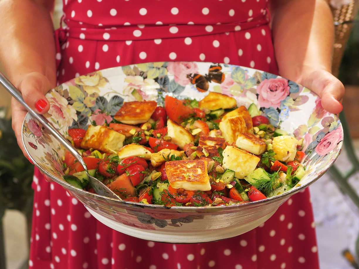 Jordgubbssallad med halloumi, tomater, nötter och honung