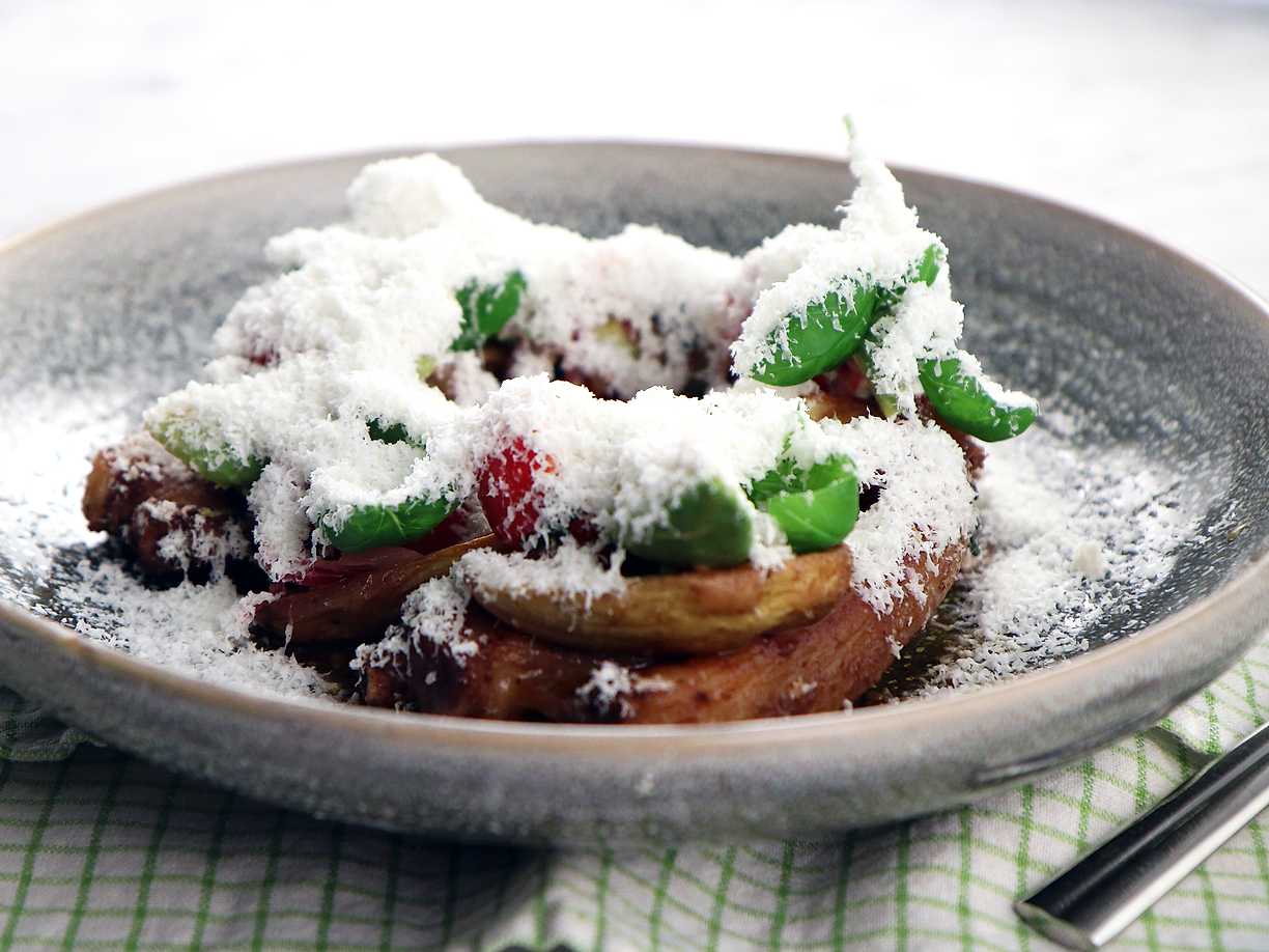 Sötpotatisgnocchi, vit sparris & ugnsbakade tomater