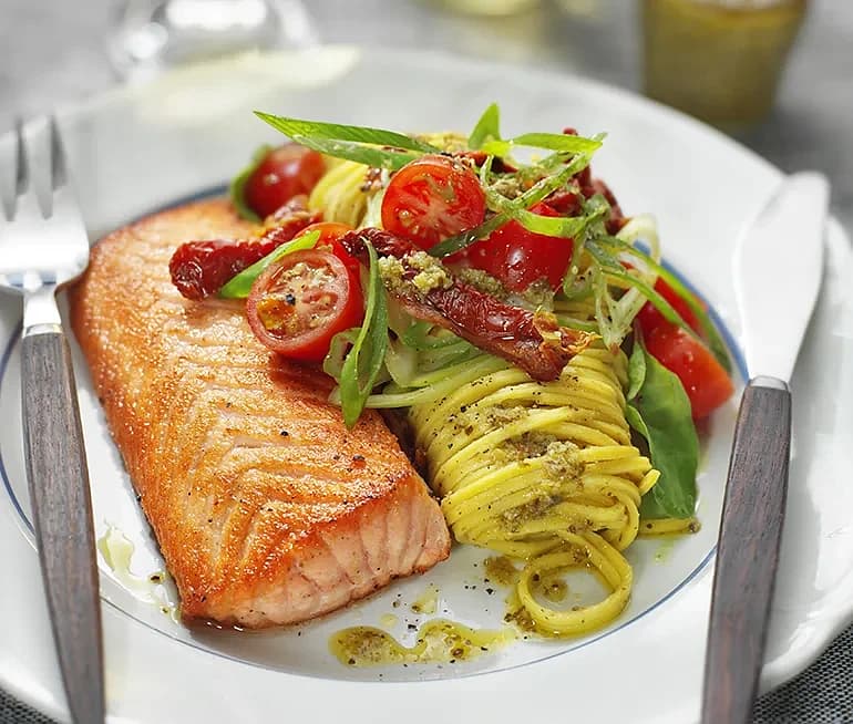 Lax med pasta pesto och tomater