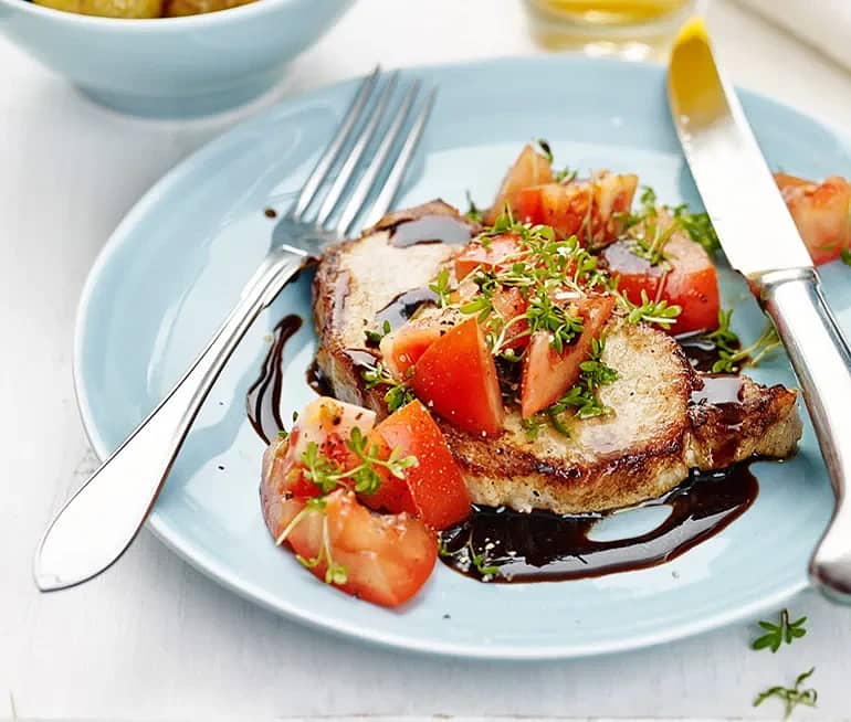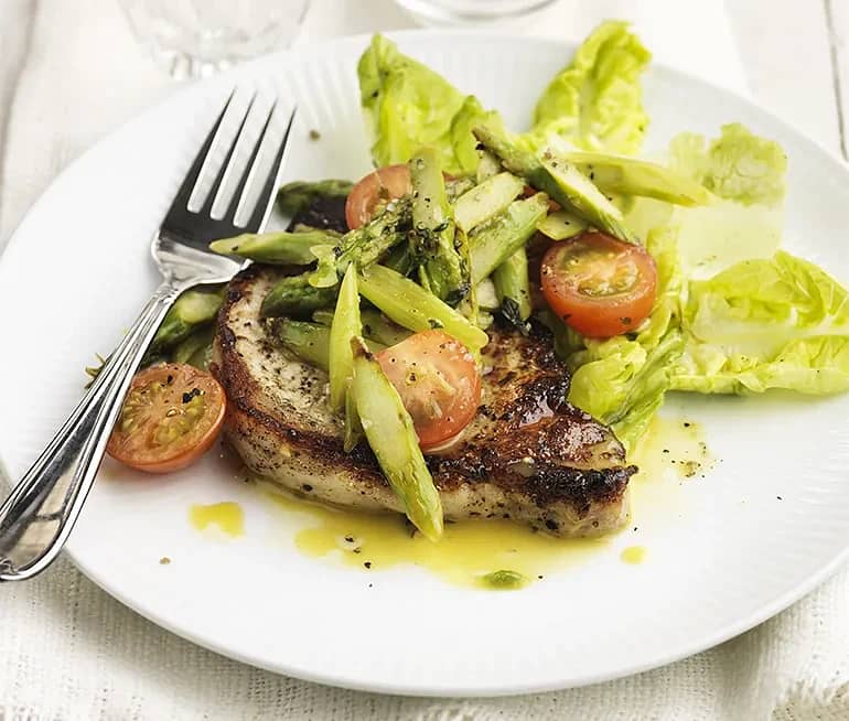 Fläskkotlett med ljummen tomat- och sparrissallad
