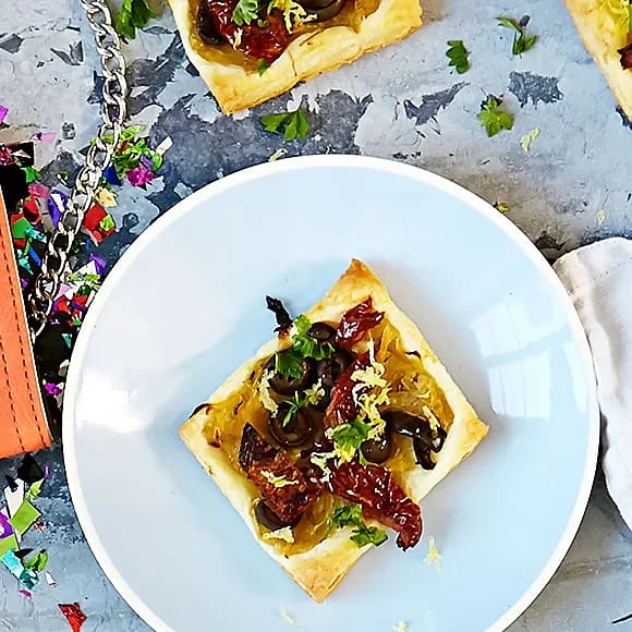 Löktarte med soltorkade tomater och oliver