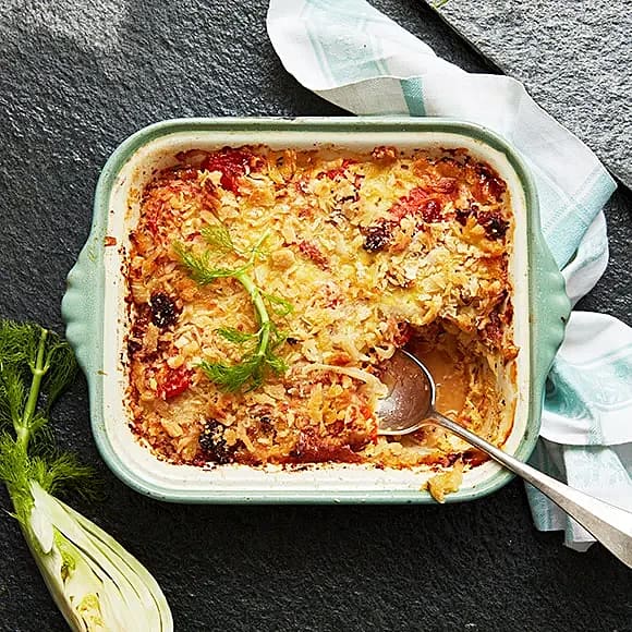 Fänkålsgratäng med salsiccia och tomat