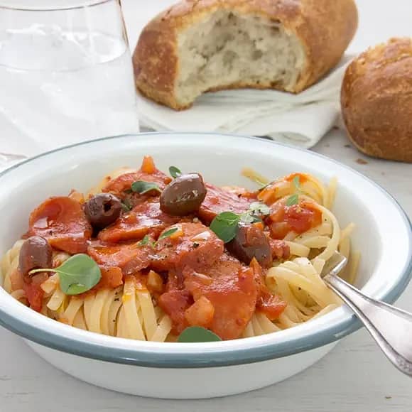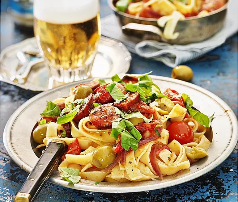 Pasta med tomat, kabanoss och oliver
