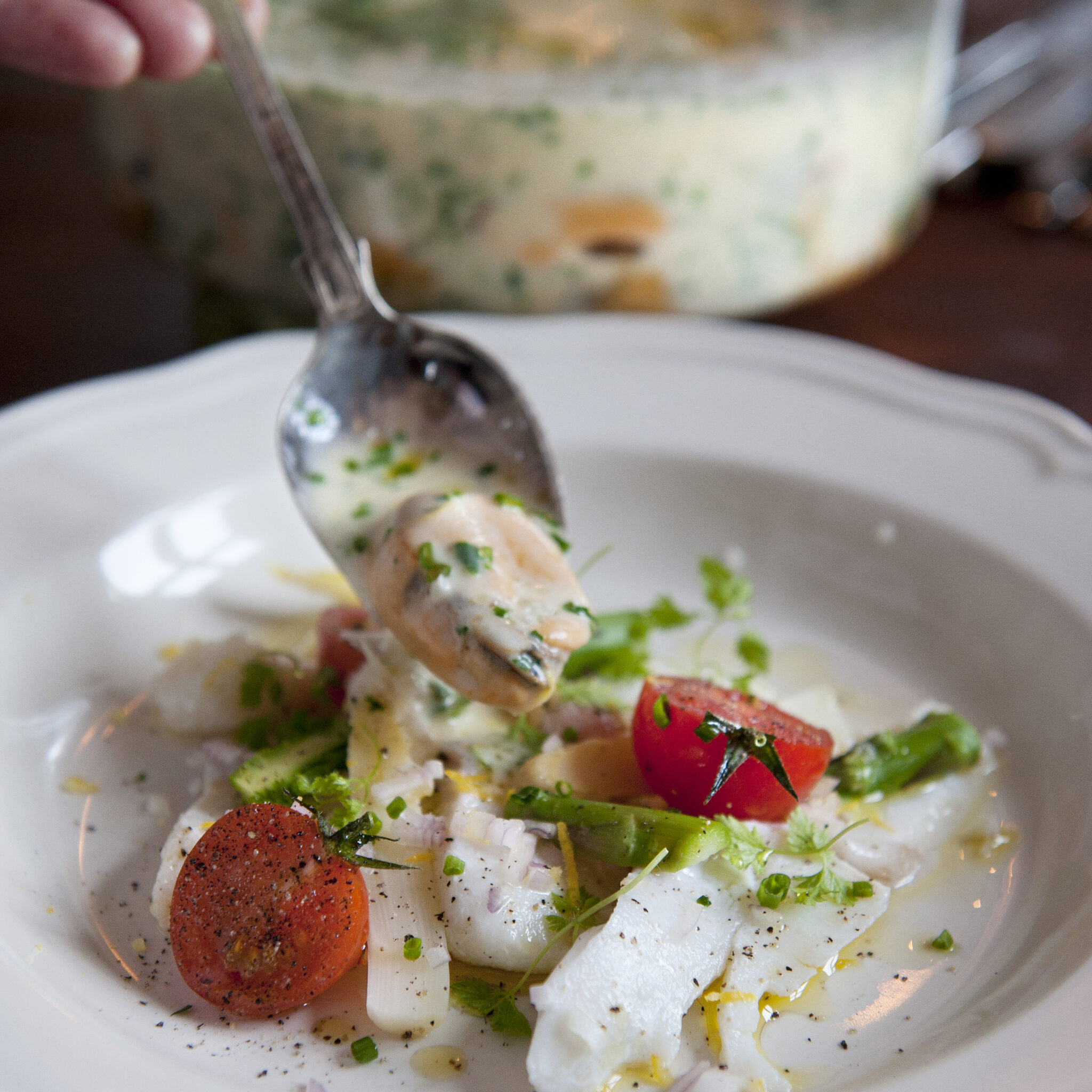 Bakad torsk med sparris, tomat och musslor