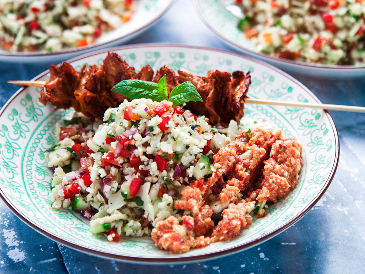 Blomkålstabbouleh med oumphspett och tomat- och myntadipp