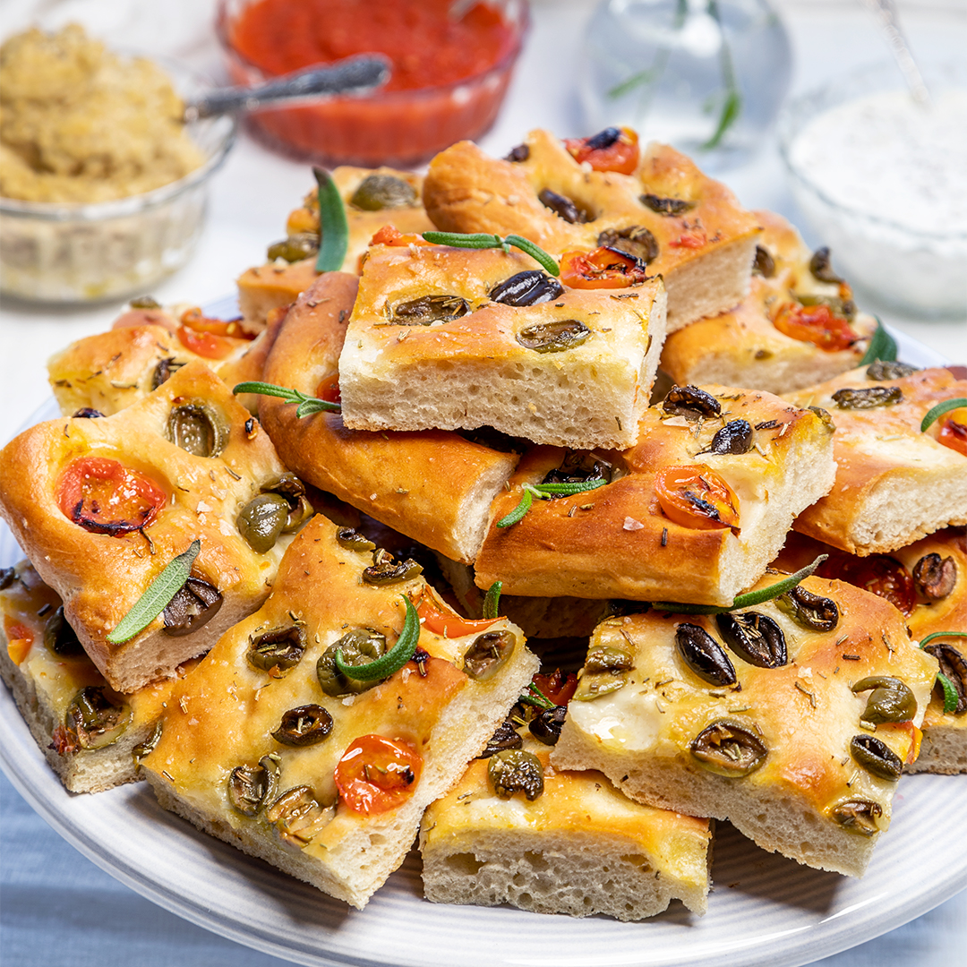 Focaccia med tomat och oliver