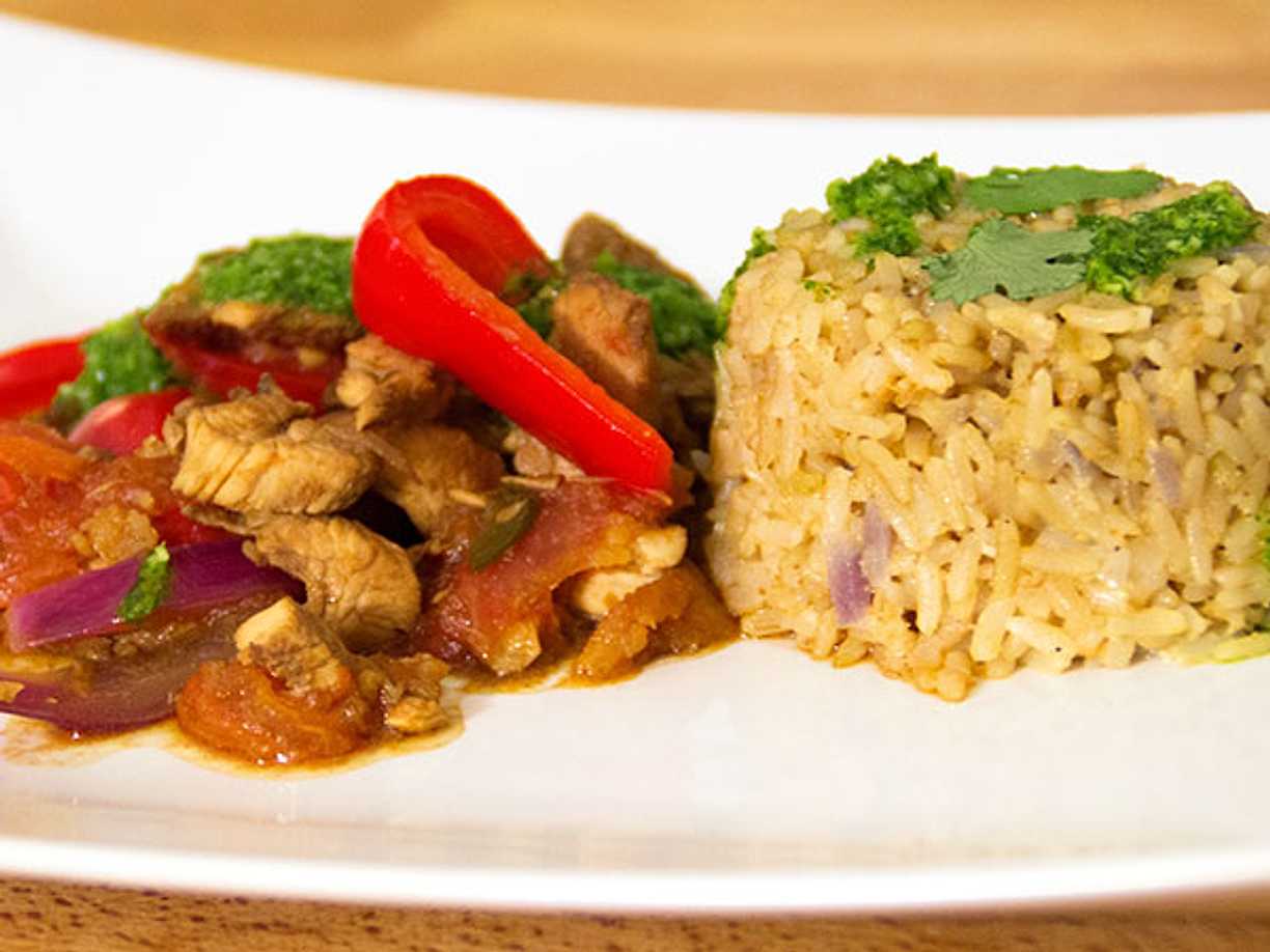 Kryddig kycklinggryta med tomat, koriander och paprika
