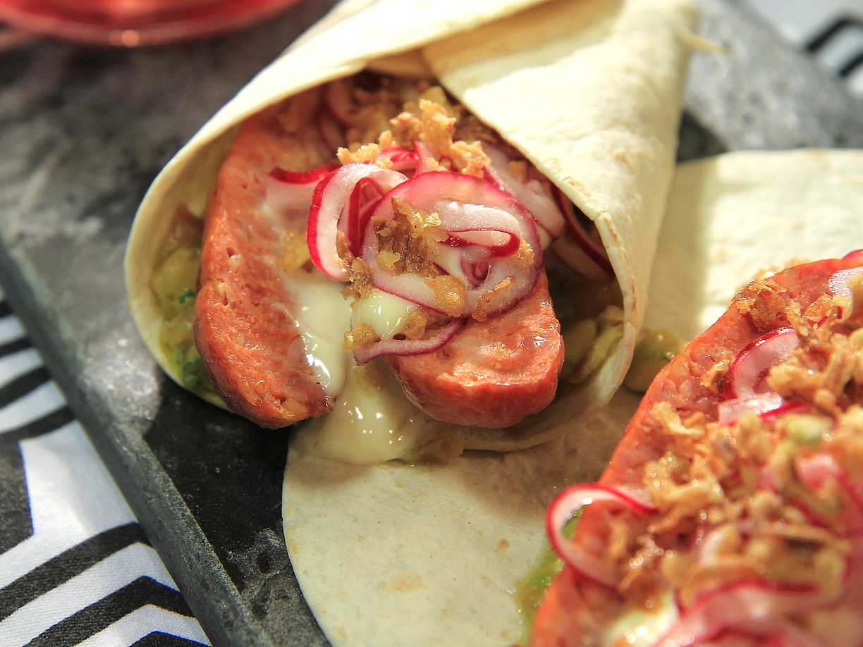 Tortillarulle med korv, avokado och tomat
