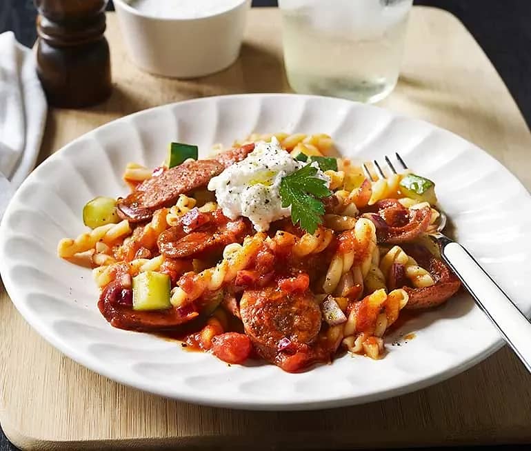 Pasta med salsiccia, tomat, zucchini och ricotta