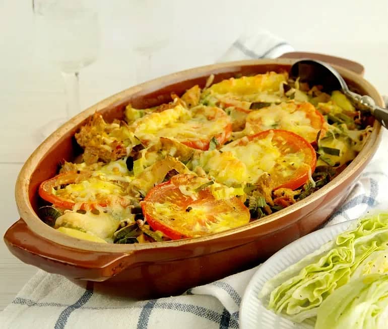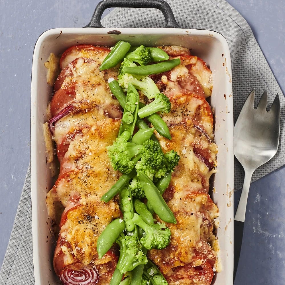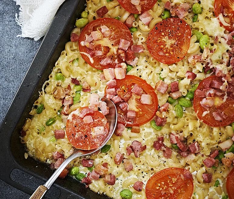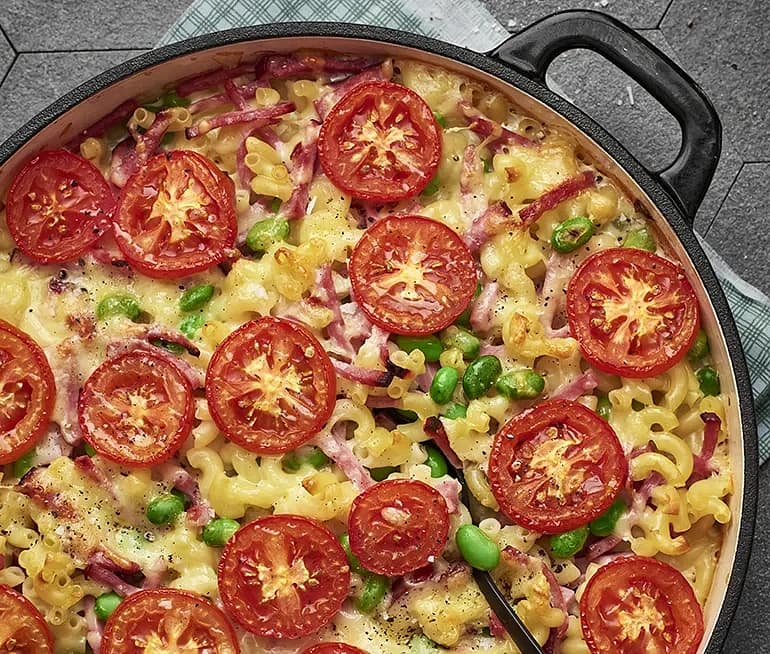 Pastagratäng med skinka och tomat