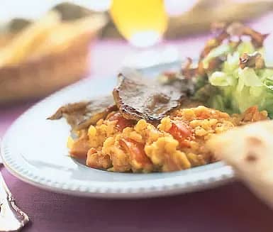 Skinkschnitzel med tomat- och kokoslinser