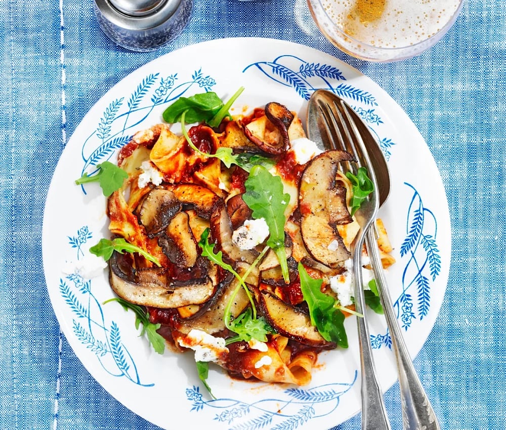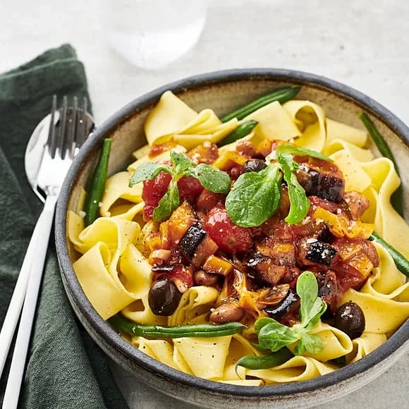 Auberginepasta med tomat och borlottibönor