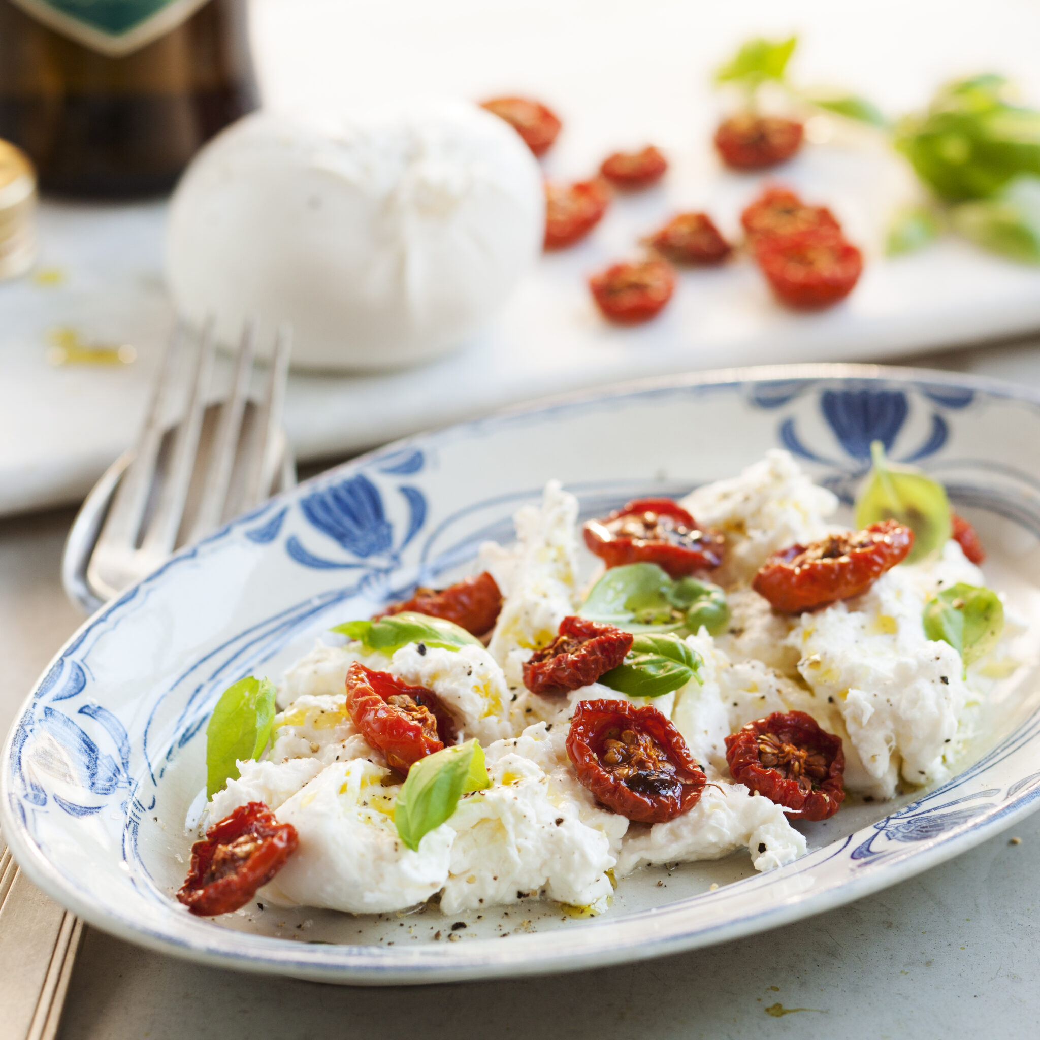 Rigatini quadri med ugnsbakad tomat och burrata