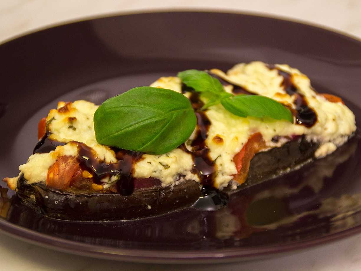 Fetaostgratinerad aubergine med tomat och basilika