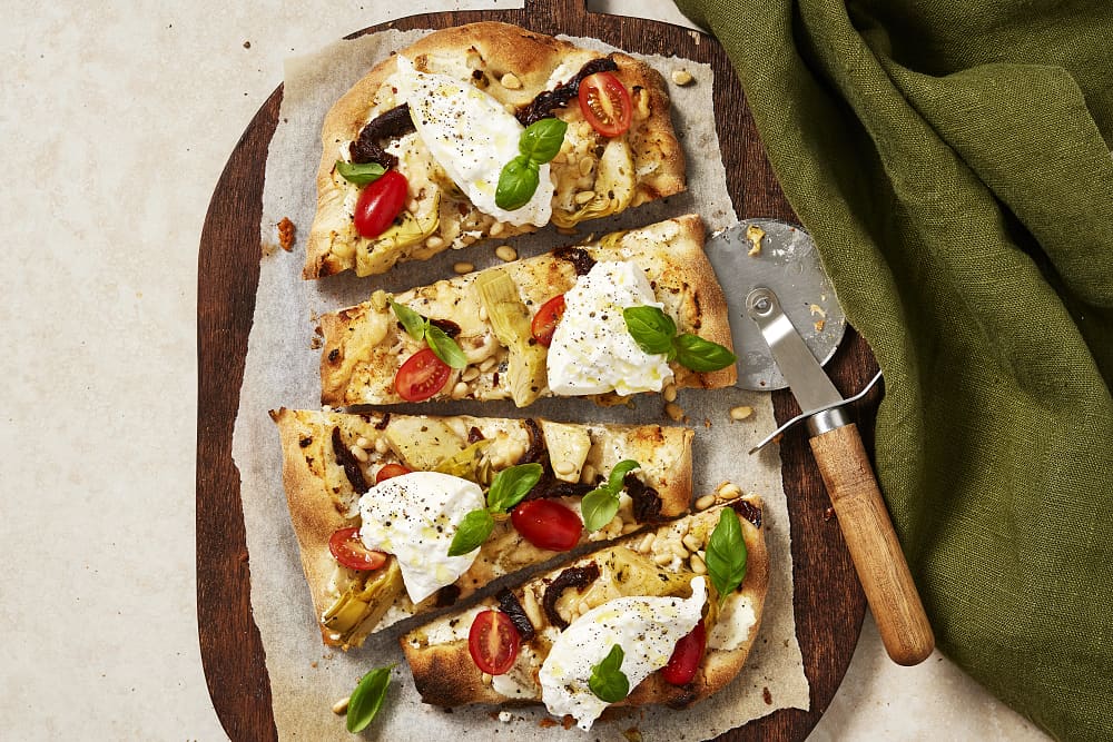 Pinsa bianco med kronärtskocka, soltorkade tomater och burrata