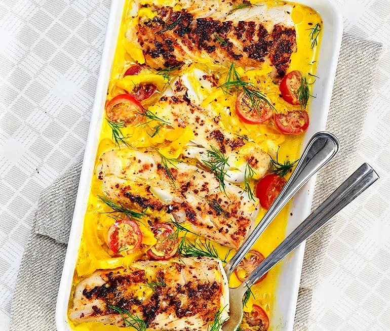 Dillbakad torskrygg med fänkål, saffran och tomat