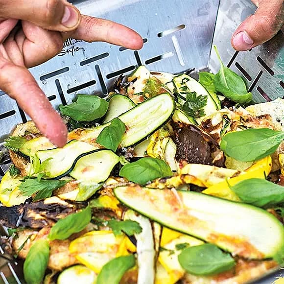 Grillad zucchini- och brödsallad med kapris och riven tomat