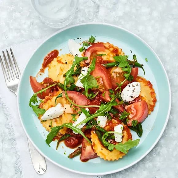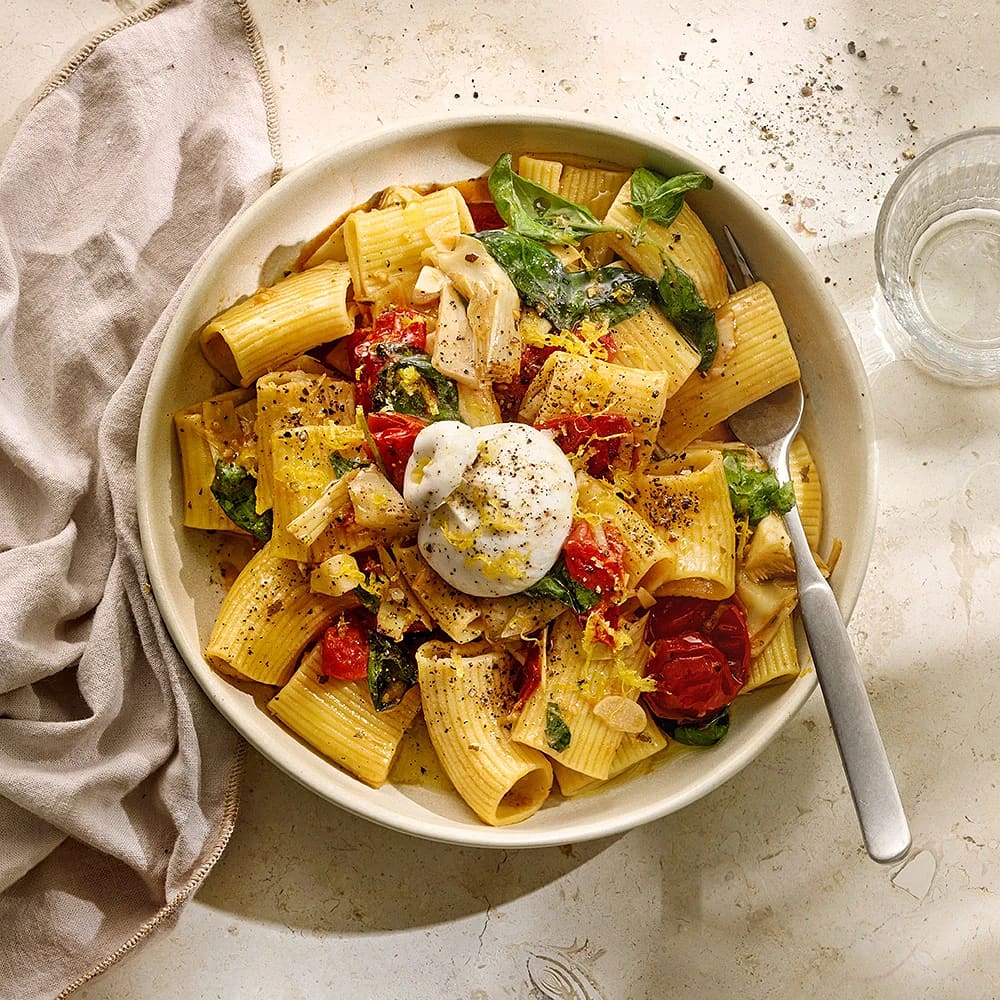 Pasta paccheri med tomat, kronärtskocka och burrata