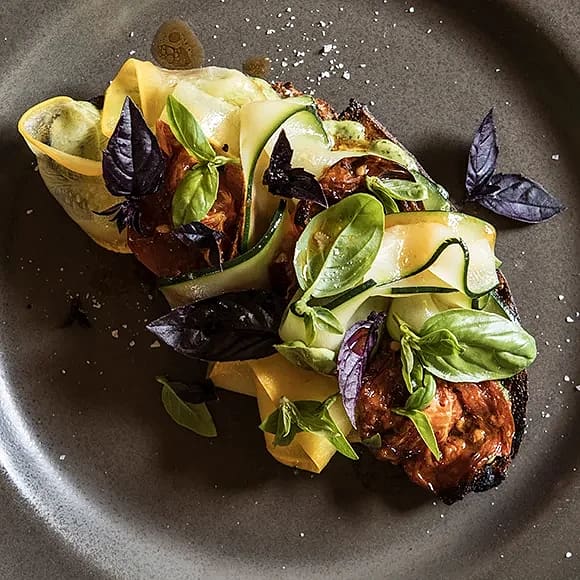 Levainbröd med oxfilé, sparris, bakade tomater och pepparrotscreme