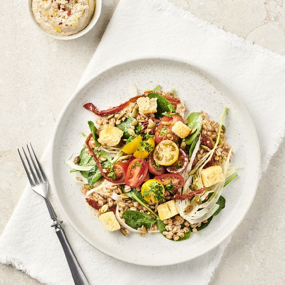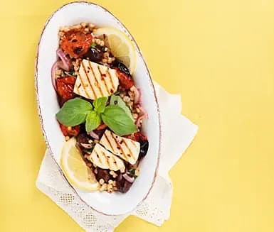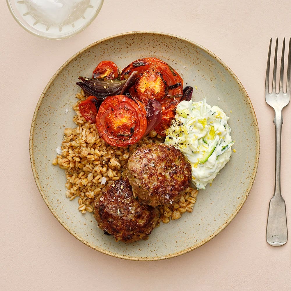 Lammfärsbiffar med rostade tomater, tzatziki och matvete
