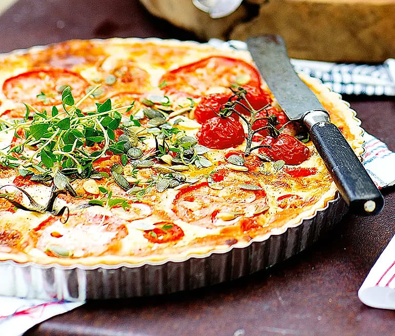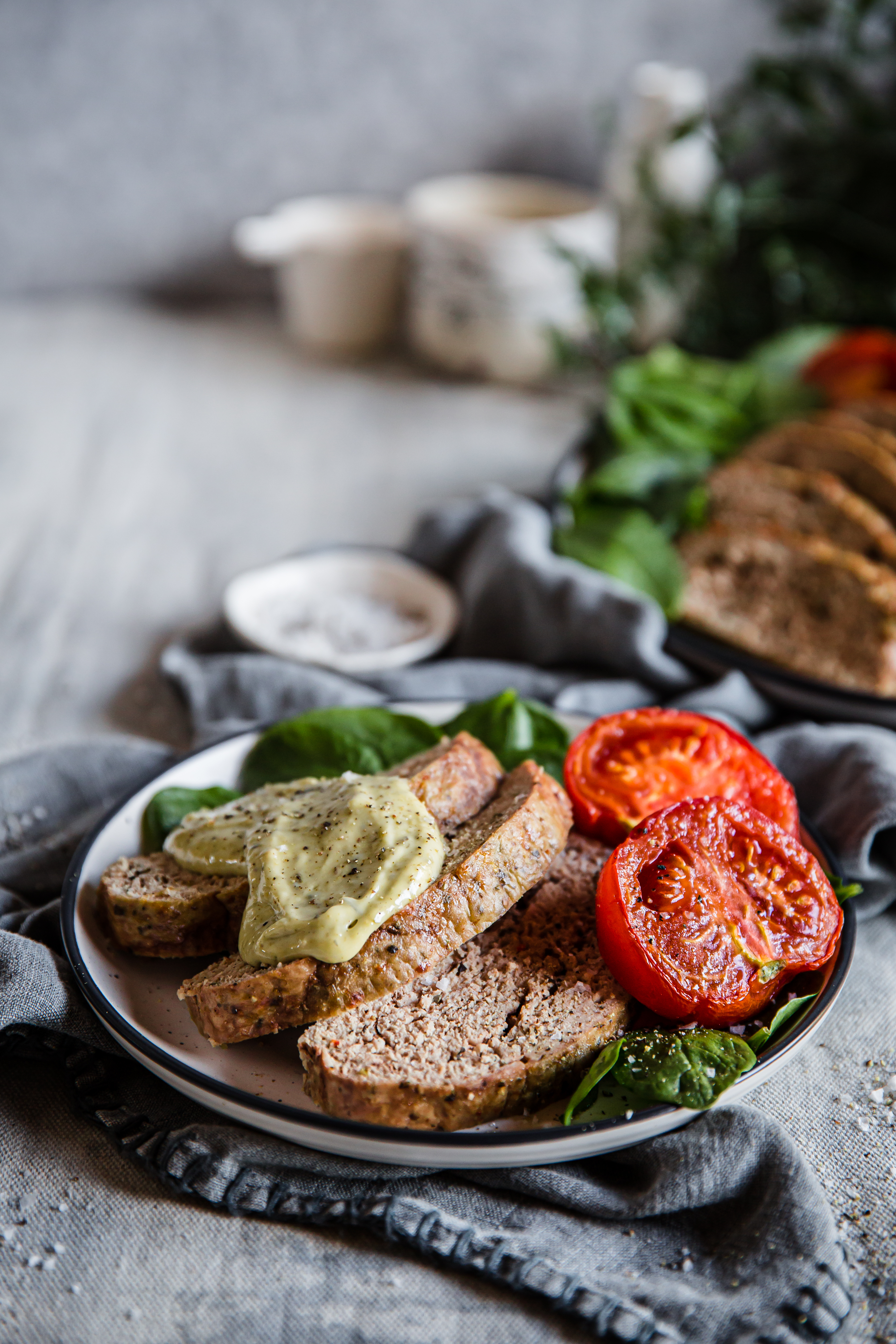 Italiensk köttfärslimpa med ugnsbakade tomater och pestomajonnäs
