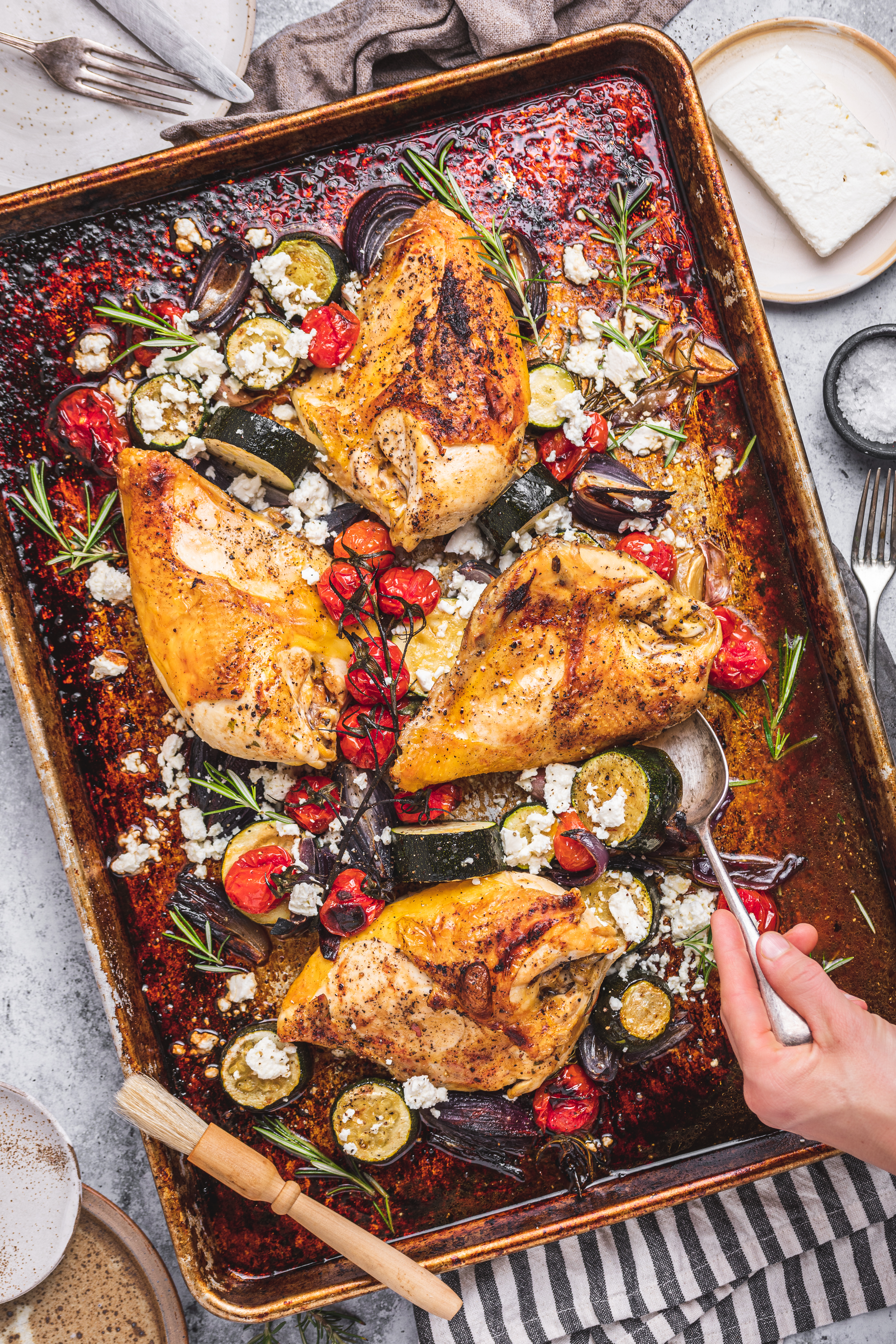 Ugnsrostade medelhavsgrönsaker med fetaost och soltorkade tomater
