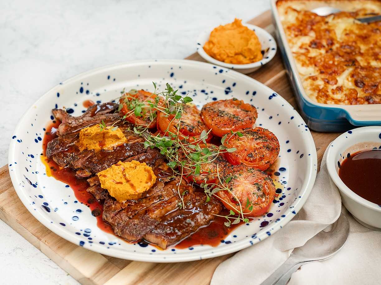 Entrecôte med rödvinssås, bakade tomater och potatisgratäng