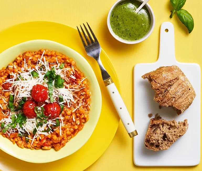 Linsotto med pecorino och tomat