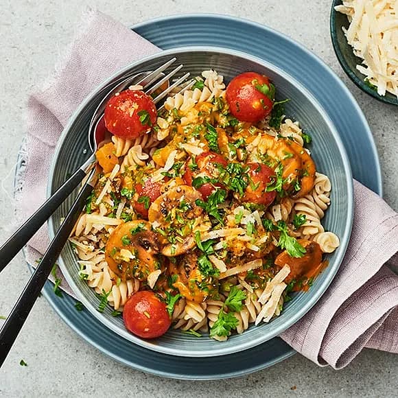 Linspasta med svamp, vitlök, persilja och tomat