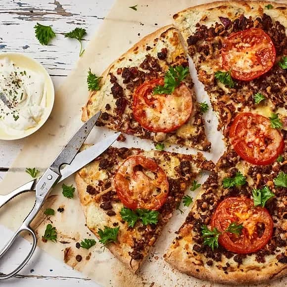 Pizza bianco med vitlöksfärskost, quorn och tomat