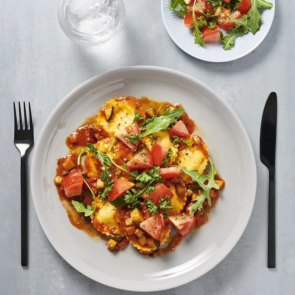 Färsk tortellini med stekta tomater, mozzarella och pecorinoost