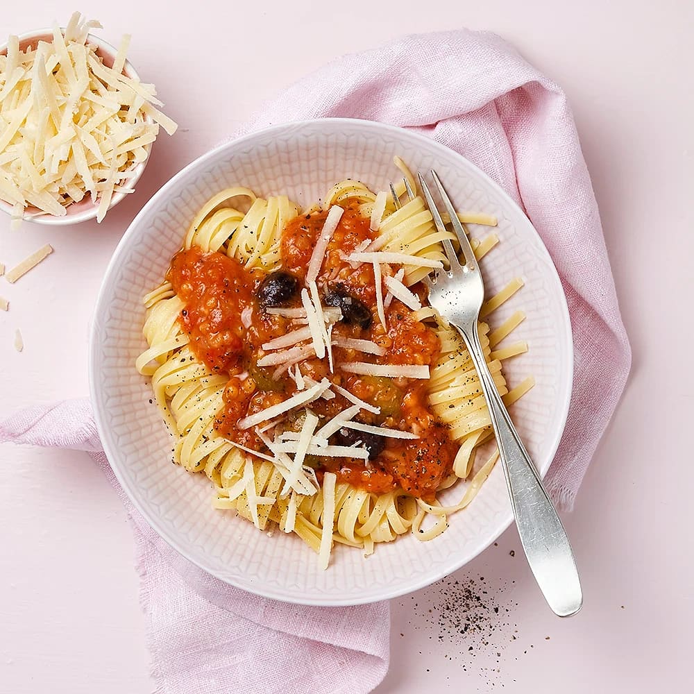 Linguine med tomat, lins och olivsås