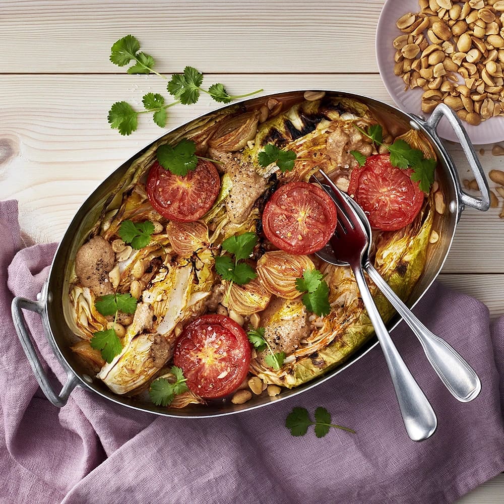 Harissabakad spetskål och tomat med jordnötssås