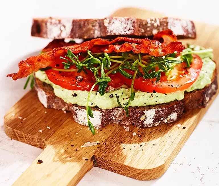 Frukostmacka med avokadofärskost, bacon, tomat och ärtskott